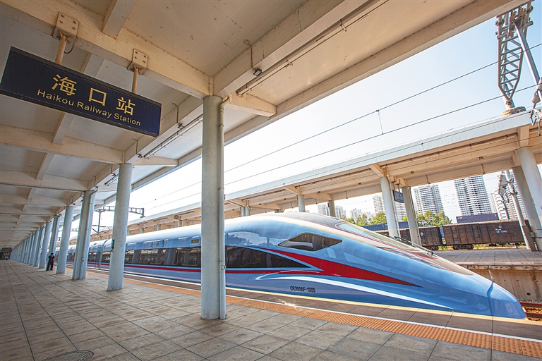 1月31日,CR300AF型复兴号动车组登陆海南岛。图为CR300AF型复兴号动车组在环岛高铁海口站。 海南日报记者 袁琛 摄