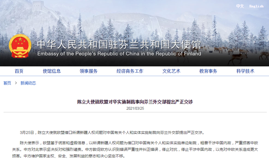 据中国驻芬兰大使馆消息,3月25日,中国驻芬兰大使陈立就欧盟借口所谓新疆人权问题对中国有关个人和实体实施制裁向芬兰外交部提出严正交涉。