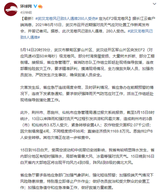原标题:最新!武汉龙卷风已致8人遇难280人受伤 定为EF2级龙卷风