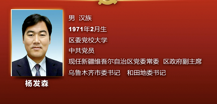据《新疆新闻联播》10月25日晚报道,中国共产党新疆维吾尔自治区第十届委员会第一次全体会议举行,选举杨发森为中国共产党新疆维吾尔自治区第十届委员会常务委员会委员。简历显示,杨发森现任新疆维吾尔自治区党委常委、区政府副主席、乌鲁木齐市委书记、和田地委书记。