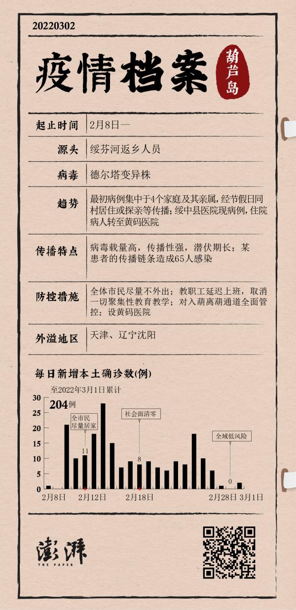 葫芦岛本轮疫情档案:至3月1日累计报告本土确诊病例204例,3月2日无新增。