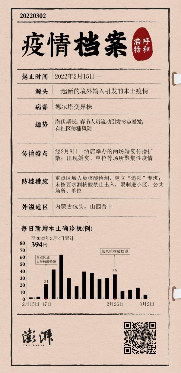 呼和浩特本轮疫情档案:至3月2日累计报告本土确诊病例394例。