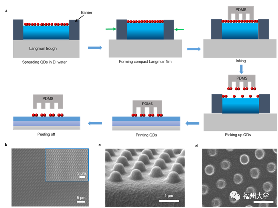 (a)LB-TP工艺示意图;(b)微结构PDMS印章的光学显微镜图像;(c-d)微结构PDMS印章的扫描电子显微镜图像(直径,间距和高度均为500 nm)