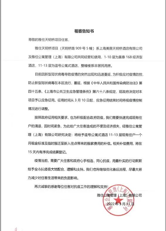相关部门也承认,由于防疫形势紧迫,所以此次征收和撤离时间比较紧张,对由此给相关租户带来不便深表歉意。未来也会不断完善防疫处置流程,接受市民和网友指正。同时,徐汇区相关职能部门将协同酒店方做好清退押金、租金以及补偿(含搬家费)等工作。