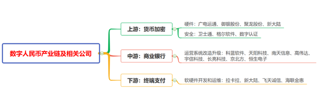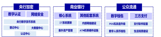 数字人民币带动的产业非常广泛,数字人民币的落地在央行发行方面,需要加密技术与网络安全,商业银行管理服务方面IT系统需要升级改造,ATM需要升级相关服务;在流通环节,需要对POS机等软硬件设备升级、对数字钱包应用进行普及。