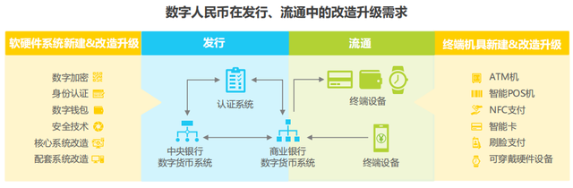 数字人民币的落地在央行发行侧需要加密技术与网络安全,银行侧需要IT系统的升级改造,ATM升级等服务;在流通环节,需要对POS机等软硬件设备升级、对数字钱包应用进行普及。将会为产业链相关企业带来业务增量。