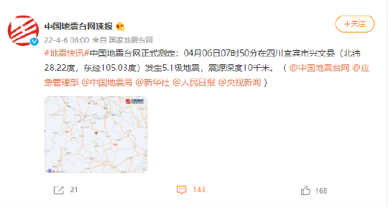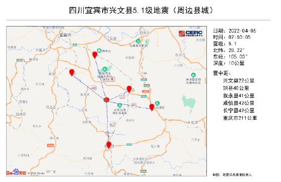 中国地震台网正式测定:04月06日07时50分在四川宜宾市兴文县(北纬28.22度,东经105.03度)发生5.1级地震,震源深度10千米。