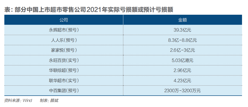 被苏宁收购80%股权的家乐福2021年上半年亏损7.7亿元。主营大润发超市的高鑫零售截至2021年9月末的半年里净利下滑了86%,如果剔除租金收入,下滑幅度更加惨烈。