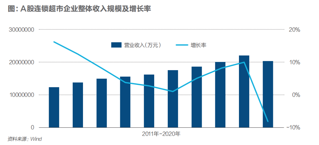 据Wind的统计,自2011年起,A股连锁超市企业增长率从2011年的15%以上陡然下滑,2016年起有一定程度回升,直至2020年跌到仅10%。