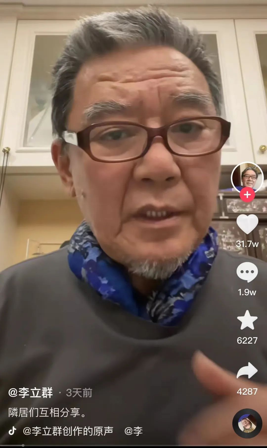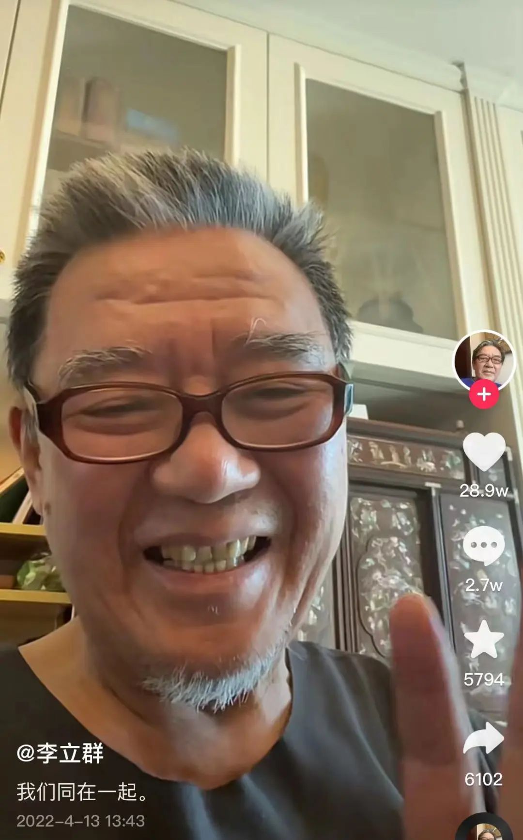 上海封控期间,李立群经常在抖音分享个人居家琐碎日常,晒太阳、做饭、吃饭、参与团购、做核酸等,还贡献了不少段子,“再封个几天,估计就要化成一股青烟,袅袅而去”“烟要少抽,不是为了健康,主要是怕断货”“专心吃饭,待会再来口小酒”“居委会太给力,我就坐享其劳”……在各种视频里,李立群永远是一副乐呵呵的样子,其乐观的精神感染了不少人,相关视频也多次出圈。