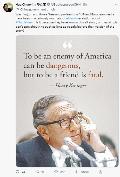 [环球网报道 记者 索炎琦]“美方被曝秘密炸掉北溪天然气管道”一事引发广泛关注。北京时间10日下午,华春莹在社交媒体推特上发文,抨击美国、欧洲媒体对知名调查记者西摩·赫什的这一爆料保持“神秘的沉默”,还发了张图,图上写着美国前国务卿基辛格的一句名言:“做美国的敌人是危险的,而做美国的盟友则是致命的”。
