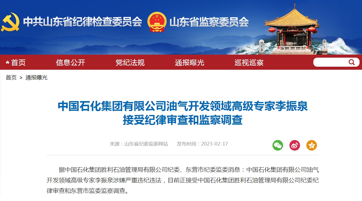 据中国石化集团胜利石油管理局有限公司纪委、东营市纪委监委消息:中国石化集团有限公司油气开发领域高级专家李振泉涉嫌严重违纪违法,目前正接受中国石化集团胜利石油管理局有限公司纪委纪律审查和东营市监委监察调查。