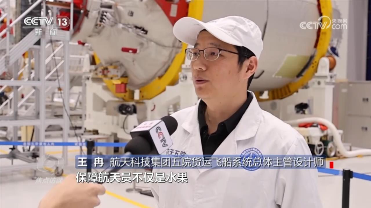 航天科技集团五院货运飞船系统总体主管设计师王冉:“后续计划上行一个大的冰箱,保障航天员不仅是水果,还有一些冷冻食品,比如将来希望在天上可以吃煎牛排,牛肉就需要在地面冷冻上行,我们的能力后面会逐步提升,保障航天员更好生活。”