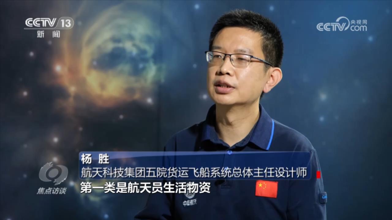 航天科技集团五院货运飞船系统总体主任设计师杨胜:“第一类是航天员的生活物资,包括吃的、喝的、卫生用品;第二类是空间站平台的备品备件;第三类是空间科学和应用的一些实验载荷、实验设备;第四类是飞船推进剂。”