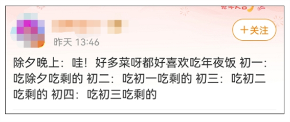 过年吃饭,讲究“年年有余”。于是,不少网友在春节,过上了天天吃剩菜的生活。