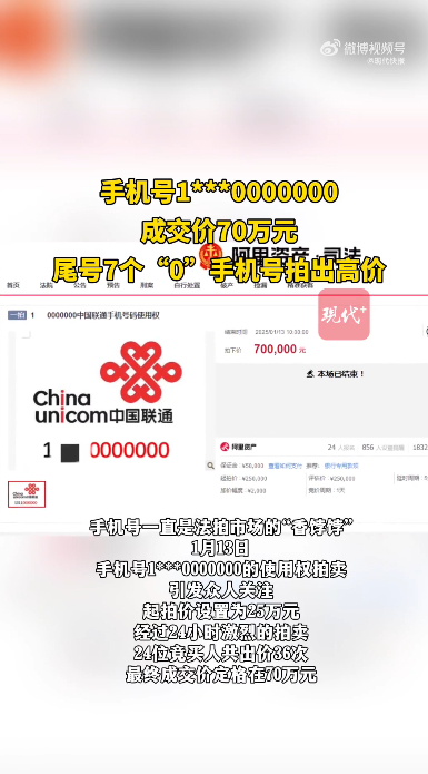 没过多长时间,又有手机号开拍了,这次是尾号7个“0”的手机号,起拍价设置为25万元,该手机号的处置单位为天津市滨海新区人民法院。1月13日,经过24小时激烈的拍卖,24位竞买人共出价36次,最终成交价定格在70万元。