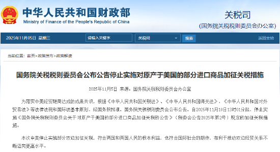 财联社11月5日电,为落实中美经贸磋商达成的成果共识,根据《中华人民共和国关税法》、《中华人民共和国海关法》、《中华人民共和国对外贸易法》等法律法规和国际法基本原则,经国务院批准,国务院关税税则委员会公布公告,自2025年11月10日13时01分起,停止实施《国务院关税税则委员会关于对原产于美国的部分进口商品加征关税的公告》(税委会公告2025年第2号)规定的加征关税措施。