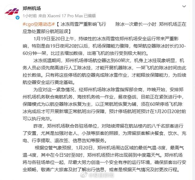 20日一早,郑州机场发布信息称,1月19日至20日上午,持续性的冰冻雨雪给郑州机场安全运行带来严重影响,特别是自19日夜间20时以后,机场保障能力骤降,每架航空器除冰时长约30-60分钟,比过去增加数倍,出港飞机的放行受到极大制约。