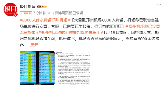 [大雪致郑州机场8000人滞留,机场称已联合各驻场单位进行安置,客服:已恢复正常起降,但仍有航班积压]#郑州机场称已安置滞留旅客##郑州机场称航班恢复起降仍有积压#1月19日夜间,因持续大雪,郑州新郑机场跑道关闭,航班停飞。机场官方发布的数据显示,当晚有8000余名旅客滞留航站楼。20日上午,极目新闻记者从机场客服了解到,目前机场已恢复正常起降,因仍有积雪,放行缓慢。