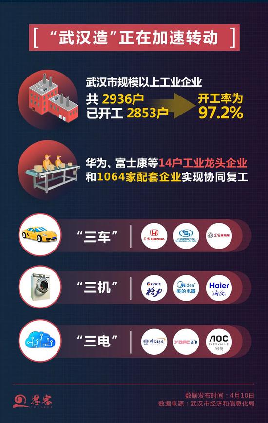 截至目前,武汉97.2%的规上工业企业已重新开工,工业生产活力十足;全市277家市级以上农业产业化龙头企业全部复工,农业生产物资充沛。