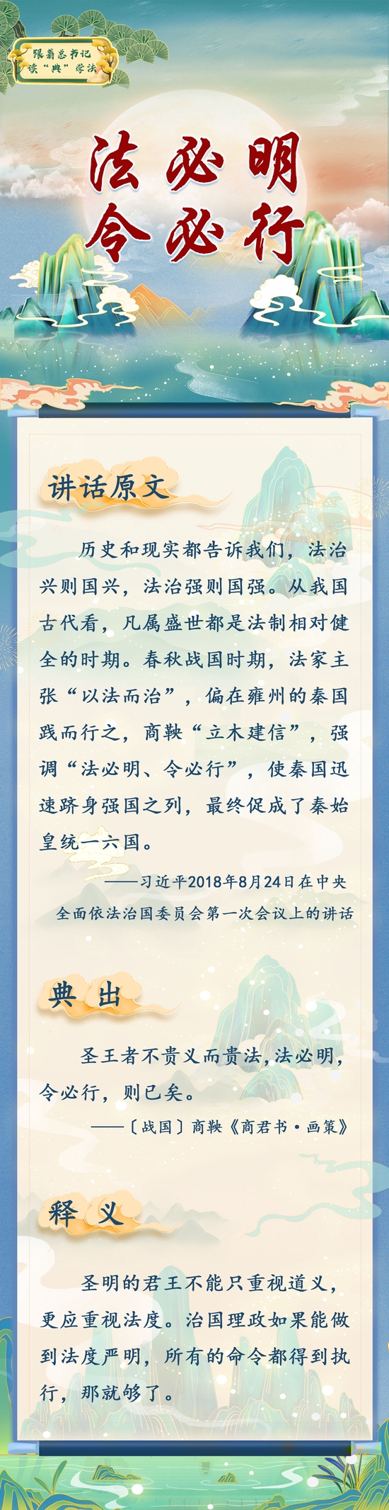 2013年2月23日,习近平总书记在中共十八届中央政治局第四次集体学习时,完整地讲述了这个故事,并语重心长地说:“全面推进依法治国,必须坚持严格执法。法律的生命力在于实施。如果有了法律而不实施,或者实施不力,搞得有法不依、执法不严、违法不究,那制定再多法律也无济于事。”新时代新征程上,我们要继承和发扬“法必明、令必行”的中华优秀传统法律文化,全面推进严格规范公正文明执法,加快建设公正高效权威的社会主义司法制度,不断提高执法和司法公信力,更好发挥法治固根本、稳预期、利长远的保障作用,在法治轨道上全面建设社会主义现代化国家。