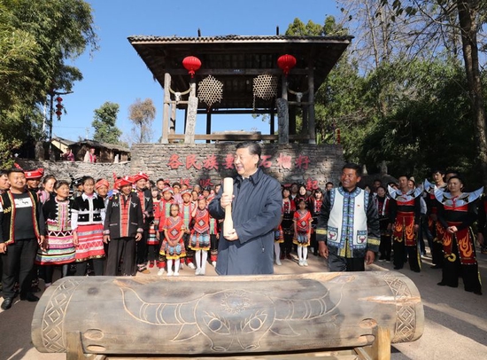 2020年1月19日下午,习近平总书记在云南省腾冲市清水乡三家村中寨司莫拉佤族村广场上,敲响三声佤族木鼓,祝福来年风调雨顺、国泰民安。