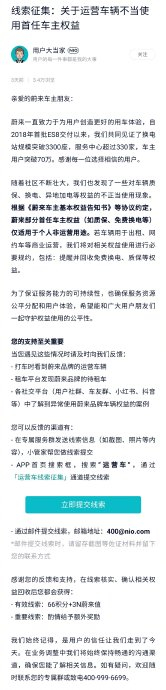 #蔚来线索征集#【蔚来发布运营车辆不当使用首任车主权益线索征集】6 月 13 日消息, 6 月 10 日,蔚来在官方 App 发布“运营车辆不当使用首任车主权益”线索征集。