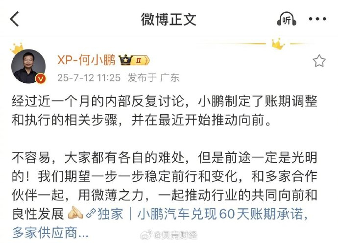 【#何小鹏回应小鹏汽车兑现60天账期承诺#:已制定执行步骤】新京报贝壳财经讯(记者张冰)针对兑现60天账期承诺,小鹏汽车董事长、首席执行官何小鹏7月12日在其社交媒体发文称,“经过近一个月的内部反复讨论,小鹏制定了账期调整和执行的相关步骤,并在最近开始推动向前。不容易,大家都有各自的难处,但是前途一定是光明的。我们期望一步一步稳定前行和变化,和多家合作伙伴一起,用微薄之力,一起推动行业的共同向前和良性发展。”