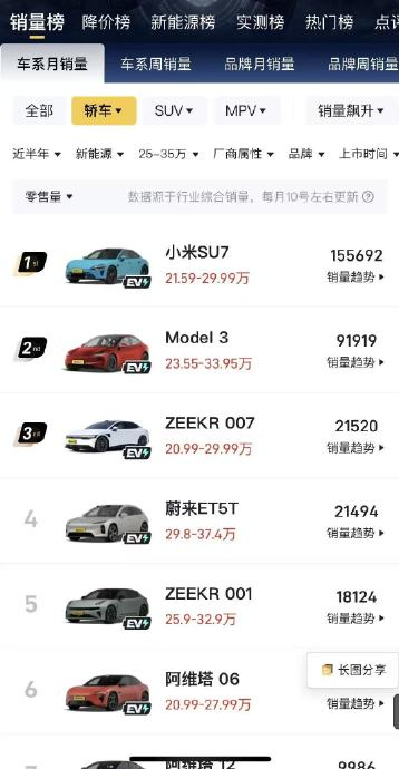 【#特斯拉销量冠军因SU7加了定语#】7月22日,有网友发现特斯拉Model 3在2025上半年作为中国纯电中型车销冠,是因为加了车型定语,如果不加定语,那小米SU7的销量将会超过Model 3。这一发现,引评论区热议。据了解,2025上半年,小米SU7的累计销量为155692辆;而特斯拉Model 3累计销量则为91919辆。@白鹿视频
