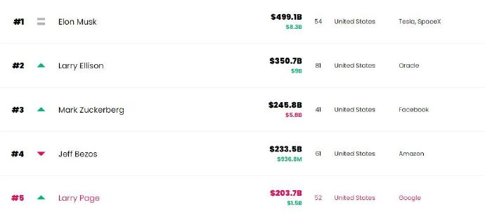【今年#特斯拉股价已涨超14%##马斯克比第二大富豪多1500亿美元#】据《福布斯》实时富豪榜显示,截至美国东部时间10月1日下午4点15分,马斯克的净资产达5001亿美元,比全球第二大富豪、美国软件公司甲骨文的创始人埃里森的个人资产多近1500亿美元。不过,随着特斯拉股价在当天美股尾盘涨幅收窄,马斯克的身价也出现缩水。截至当天收盘,马斯克身价约4991亿美元。