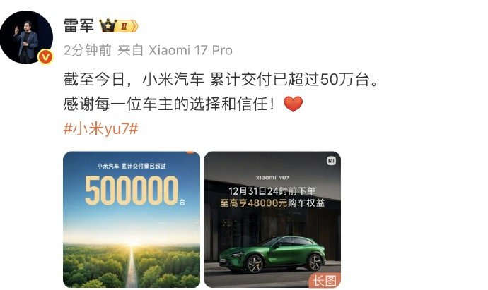 #雷军感谢车主的选择和信任#【#雷军称小米汽车累计交付超50万台#】雷军发文称:“截至今日,小米汽车 累计交付已超过50万台。感谢每一位车主的选择和信任!” #小米汽车交付量已超全年目标#