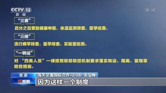 海关总署国际合作司司长 张宝峰:“三查”“三排”“一转运”是我们海关多年来摸索探索形成的一个比较成熟的、规范的应对重大国外疫情传入的制度模式。运行这个模式,主要有三个方面,第一就是海关的执行,海关在执行方面我们是非常有信心的。