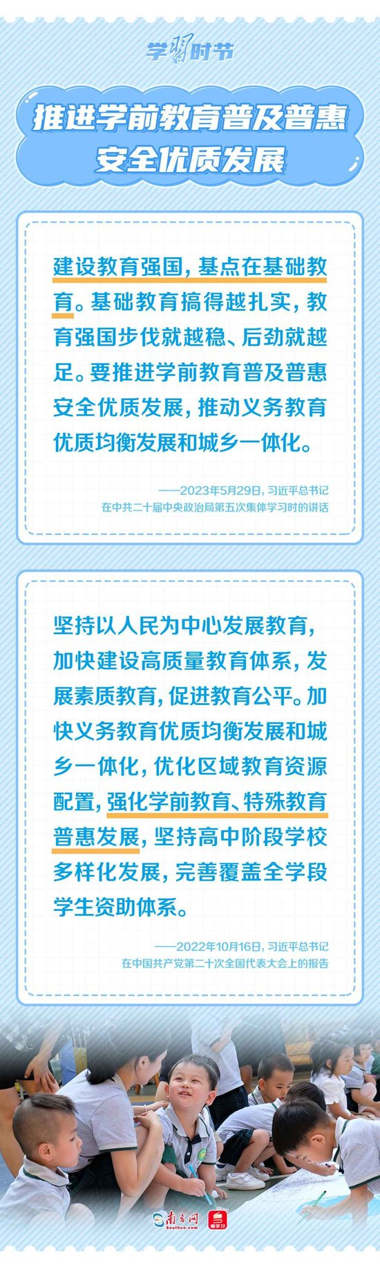 学前教育是我国基础教育体系的重要组成部分,对孩子塑造强健体魄、养成良好习惯起着基础性和先导性作用。习近平总书记多次强调,要加强对基础教育的支持力度,办好学前教育,促进学前教育普惠发展,努力让每个孩子都能享有公平而有质量的教育。今天,我们梳理了总书记的相关重要论述,邀您一同学习领悟。