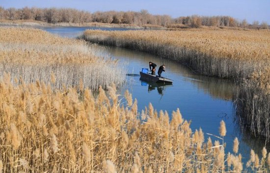 工作人员在策勒县沙海玉湖下网捕捞螃蟹。汤永 摄