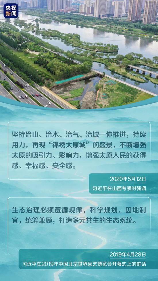 眼前的汾河清水复流,再现碧波荡漾的大河风光。沿岸绿树葱郁,宛如一条条绿色长廊。习近平沿河岸边步行察看汾河水治理及两岸生态保护、城市环境建设等情况,对太原汾河沿岸生态环境的巨变表示欣慰,并首次提出了“治山、治水、治气、治城”的“四治”要求。