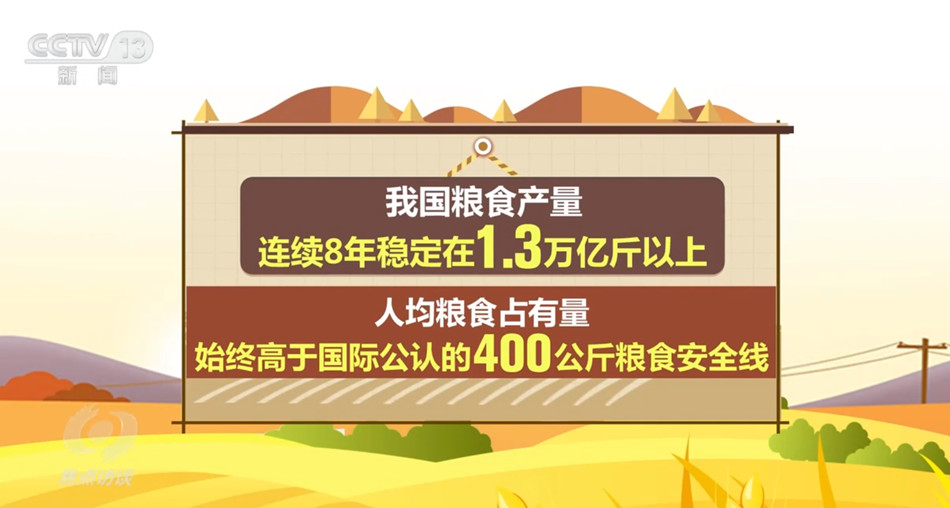 央视网消息(焦点访谈):党的十八大以来,以习近平同志为核心的党中央始终把解决粮食安全问题作为治国理政的头等大事,重农抓粮一系列政策举措有力有效,我国粮食产量站稳1.3万亿斤台阶,实现谷物基本自给、口粮绝对安全。我们把饭碗牢牢端在自己手中,为保障经济社会发展提供了坚实支撑,为应对各种风险挑战赢得了主动。连续八年1.3万亿斤,这个沉甸甸的数据是如何取得的呢?