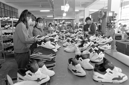 这是1993年在福建晋江一家鞋业公司拍摄的生产场景(资料照片)。以“市场调节为主,外向型经济为主,股份合作制为主,多种经济成分共同发展”为主要特征的“晋江模式”,为民营经济营造了宽松自由的发展环境。产业集群促进了民营企业间的分工协作,实现资源共享、优势互补,降低了生产成本。政策扶持、基础设施建设也为民营经济发展提供了有力保障。
