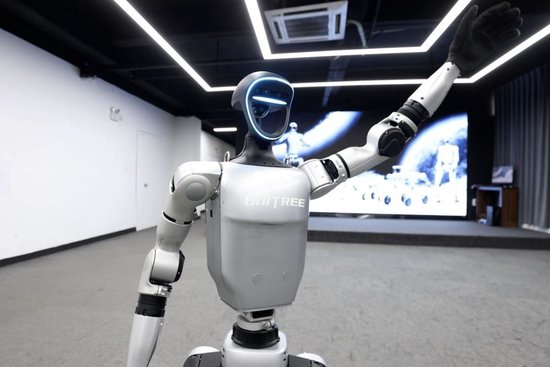 2024年11月7日在杭州宇树科技有限公司拍摄的的Unitree G1人形智能体。近年来,国内民营科技企业对机器人、人工智能等领域的研发,大幅提升了生产效率,带动相关学科发展,培养跨领域创新人才,为加快培育新质生产力注入了强劲动力。