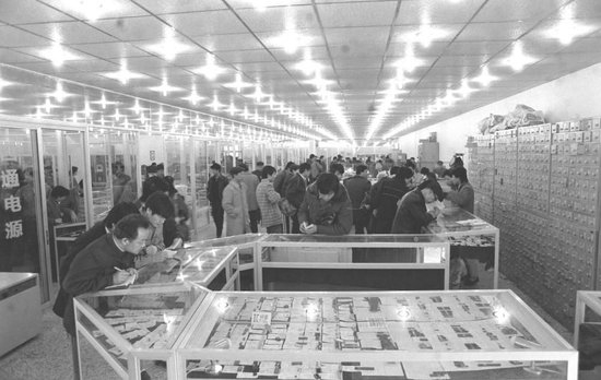这是1987年在温州市苍南县金乡镇拍摄的标牌专业市场一角(资料照片)。从全国第一张个体工商营业执照到第一个专业市场,家庭工业加专业市场的“温州模式”成为令人振奋的活力样本,营造了民营经济在温州的繁荣盛景。