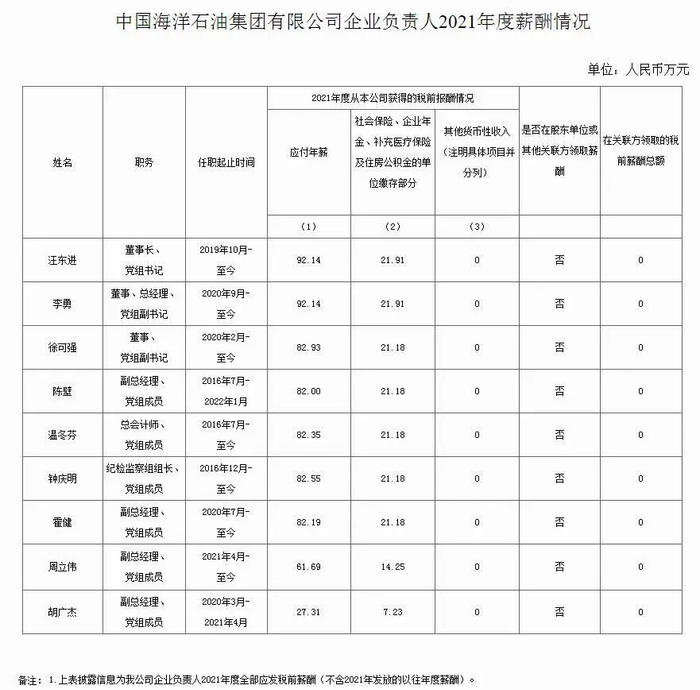 2023年1月31日,中国海洋石油集团有限公司在网站公布企业负责人薪酬信息。李勇税前应付年薪为92.14万元。