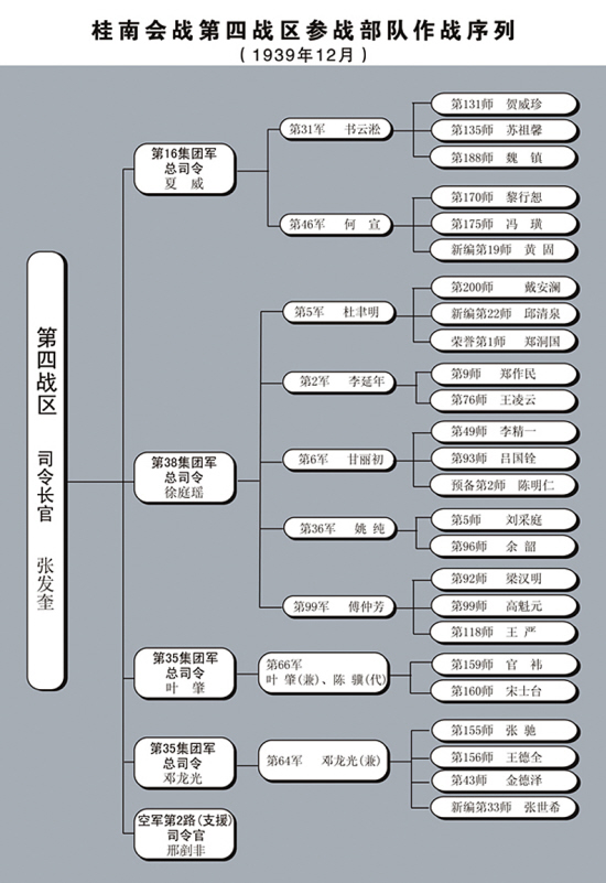 主持两广抗战以后,张发奎参与指挥了粤北会战、桂南会战、桂柳会战等一系列重要会战。在第一次粤北会战中,他采取主动出击,制敌于先的手段,调集所部向日军进攻。经过苦战获胜,粉碎了日军进犯粤北的企图,确保了临时省会曲江的安全。可惜的是,在正面战场节节败退的大势下,像粤北会战这样的胜利,并没有改变战争的总体态势。特别是,面对国民党内激烈的派系争斗,张发奎根本就无力有效调度战区内的其他军事力量,唯有在风雨飘摇中勉力维持着两广抗战大局。
