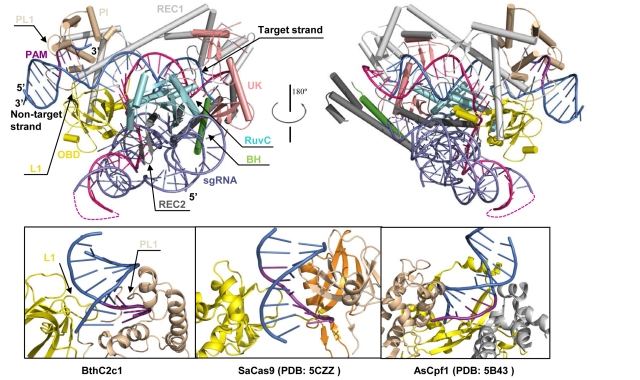 为了揭示C2c1识别crRNA和结合PAM的分子机制,该团队解析了Bacillus thermoamylovorans C2c1 (BthC2c1)和123-nt的crRNA(包含有几乎全长的crRNA以及tracrRNA),28-nt的target DNA,以及12-nt的non-target DNA的三元复合物的2.6 Å晶体结构。结构研究发现,与Cas9和Cpf1宽松型识别PAM序列不一样的是,BthC2c1通过一种严谨型方式识别PAM序列。而且通过分析结构,推测删除位于BthC2c1表面的sgRNA的Loop 1(38-nt)并不会影响BthC2c1引导剪切的活性,事实上,功能试验也证实上述推测。有趣的是,测序发现BthC2c1在target DNA上的剪切位点并不位于guide RNA:target DNA异源二聚体内,反映出和Cas9以及Cpf1不一样的剪切机制。因此,该复合物结构不仅揭示了C2c1结合sgRNA和识别PAM的分子机制,而且为改造C2c1以及其他Cas核酸内切酶,使之成为更高效、更特异的基因编辑工具提供了结构基础,具有指导改造新型基因编辑系统的应用价值。这是该课题组在病原与宿主相互作用系统以及基因编辑系统领域取得的又一研究成果。
