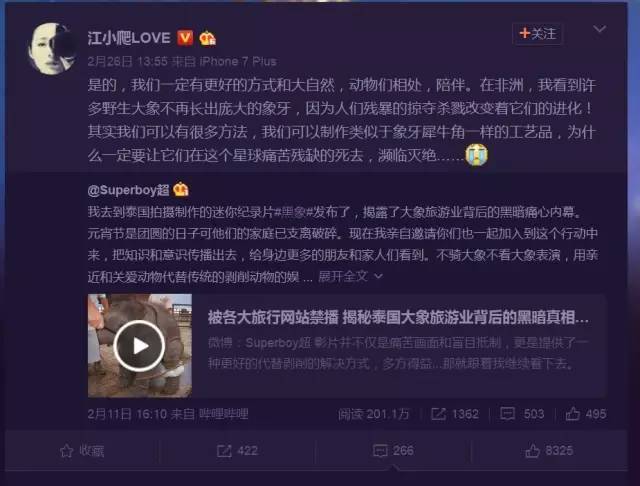 人民日报、央视等媒体纷纷转发,连明星都站出来力挺,印象最深的是江一燕说的 ——“在非洲,我看到许多野生大象不再长出庞大的象牙,因为人们残暴的掠夺杀戮,改变了它们的进化!”