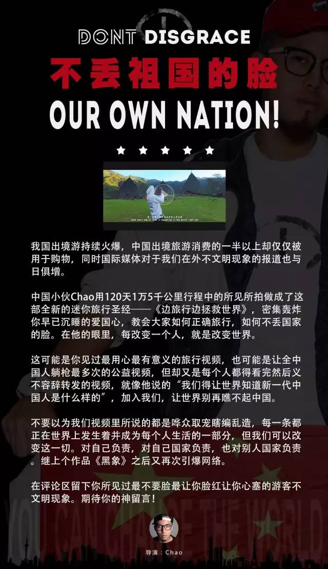 6月29日,他发布了自己的第二个视频,花了120天走过15000公里的新旅游圣经:《边旅行边拯救世界》,大胆揭穿了18个黑暗真相,“只为了让大家不要做生命旅途中的游客,只是到处走马观花拍照留念,而应该去做生命的旅行家。”