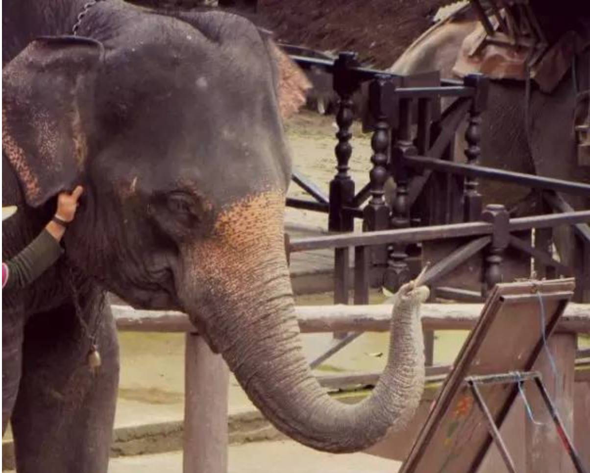 而被认为是高智商的表现,会用笔刷画画的表演,除了背后残忍的训练,每次作画,都是用木架夹着画笔,强行卡在最敏感的鼻子里,每画一下都是钻心的疼痛。