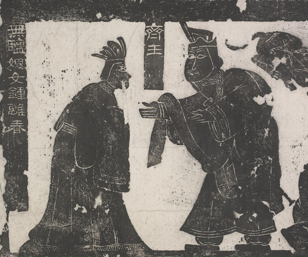 东汉武梁祠画像,表现齐宣王付印绶与无盐女,拜之为后的场景,齐王所捧绶带清晰可见
