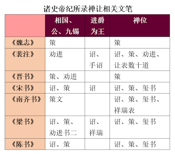 从陈寿《三国志》开始,各王朝史书都会在开国皇帝的帝纪里记录上述关于禅让的一系列过程,还会收录相应的诏策,形成了一种体例。不过《三国志》只收录了九锡策文一篇、禅位策文一篇,而南朝几史收录的文辞篇数要有两三倍,每篇的字数也越来越多。赵翼对南朝史书不厌其烦地抄录这些文辞很反感,称之为“芜词”。今天的《晋书》虽然是唐朝人编纂的,但其中收录的禅位相关文笔数量、长度都很有节制,应该还是魏晋旧传统。刘宋文帝时裴松之注《三国志》,可能给这种繁芜的取向开了头。