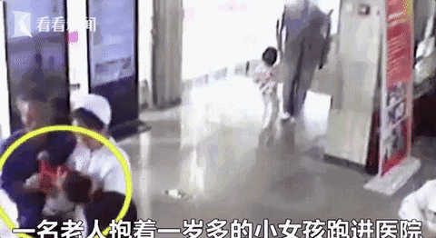 一位身穿蓝色上衣的大爷抱着一名1岁多的小女孩跑进门诊大厅入口处,他焦急地喊着:“大夫,你快看看我的孩子咋了?”