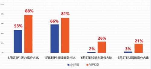 去年5月,VIPKID与ETS TOEFL Junior首次达成合作,并获得了600个考位。据ETS TOEFL Junior中国管理中心业务负责人傲日格乐介绍,在今年1月小学托福STEP1级别考试中,VIPKID学员阅读和听力的4星(最高分)占比分别比整体水平高出15%以及35%;而在更高难度的STEP2级别考试中,ETS整体阅读5星(最高分)占比为3%,VIPKID学员的5星占比为21%,是前者的7倍,ETS整体听力5星占比为2%,VIPKID学员相应占比则为26%,是前者的13倍。