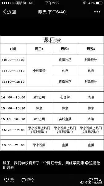 在网贴中,我有还发出了一份“网红学院”课程表,“直播技巧”、“形象设计”、“A心理学”、甚至“APP应用”“录小视频上热门”都涵盖在课程之内。